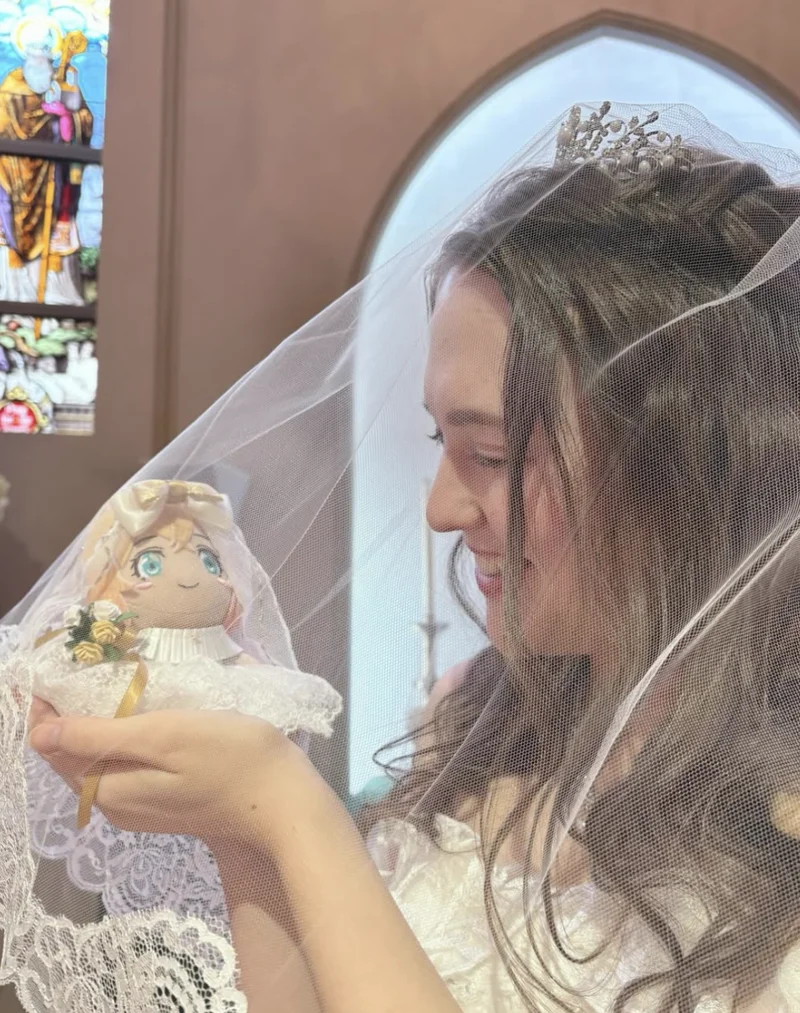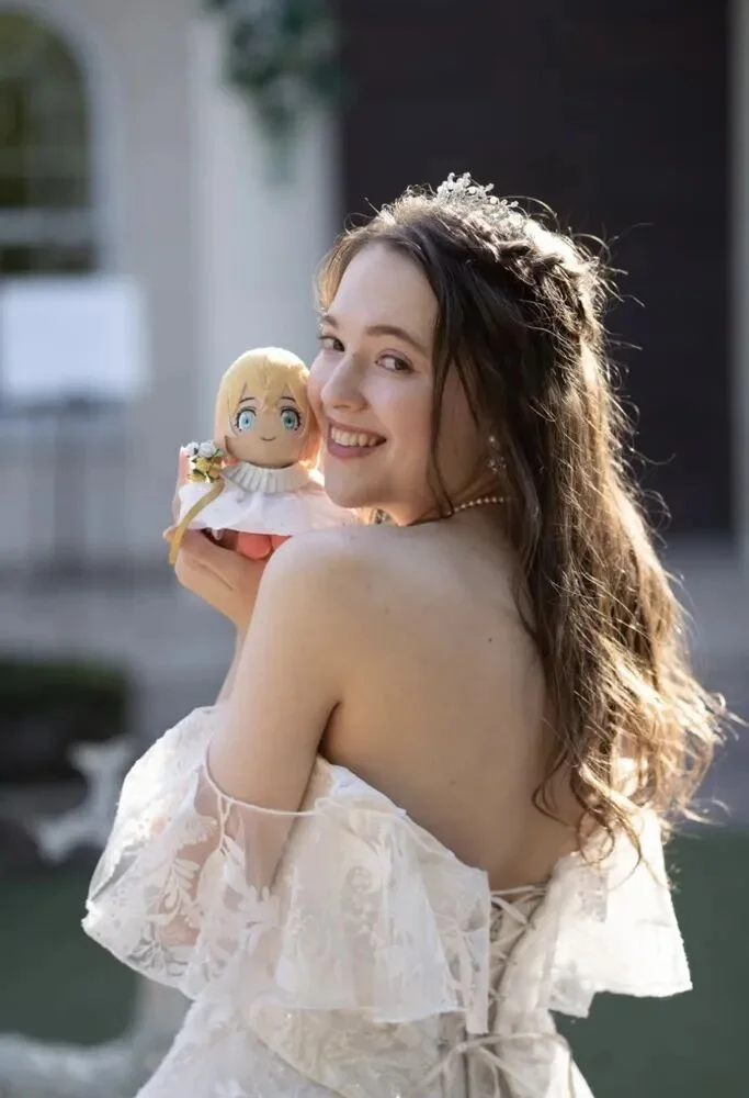 因为她的新郎,是一个来自漫画世界的角色,被做成了一只小小的毛绒玩偶,安静地躺在她的手心里。
