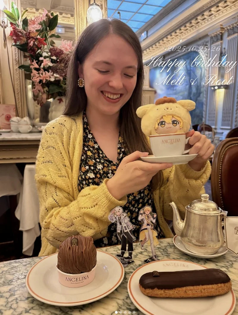 Lucie开始购买周边:手办、徽章、海报,一样不落,再后来,是玩偶。她会带着Mami出门,去咖啡馆、去旅行,拍照,记录日常。
