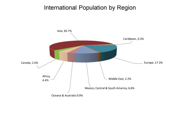 作为一所文理学院,BC国际学生不算多:最近统计的2021–2022 学年显示,BC 国际学生总数为 1,827 人,其中本科国际生约 932 人,研究生国际生约 895 人,在总体学生中的比例大约为 12% 左右。就国际学生来源国而言:华人(中国大陆/含港澳)人数最多,其次是韩国、西班牙、加拿大、印度等国家 / 地区。