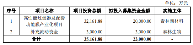 泰林生物本次发行募集资金净额为1.98亿元。其中1.4亿元用于“年产3,500套微生物控制和检测系统设备及相关耗材生产基地项目”、2793.55万元用于“研发中心项目”、3000万元用于“销售网络及技术服务建设项目”。