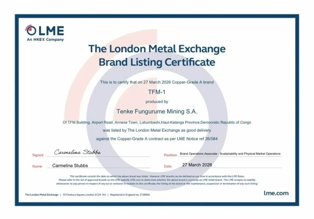 长期以来,洛阳钼业坚持技术创新与精益管理,在TFM持续完善采矿、冶炼、加工全流程质量管控体系,同步推进绿色生产与本地化运营。此次获得LME注册,将进一步提升公司铜产品在全球市场的流通性、竞争力与议价能力,也将助力品牌的国际影响力。