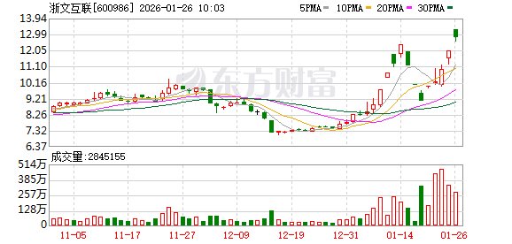 浙文互联再度涨停,5个交易日内录得3个涨停,累计涨幅为46.36%,累计换手率为96.81%。截至9:25,该股今日成交量1167.95万股,成交金额1.55亿元,换手率0.79%。最新A股总市值达197.23亿元。