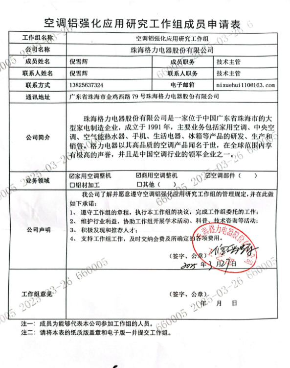 他晒出的图片是《空调铝强化应用研究工作组成员申请表》扫描件,其公司一栏为格力电器。