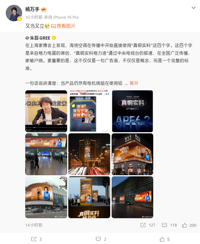 随后海信高管@杨万手也对此进行公开回应,晒出了一张图,并表示:“又当又立”。