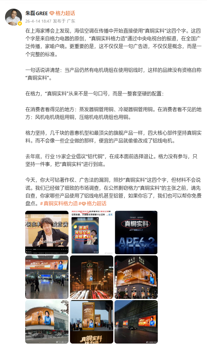 此外他还强调,去年底,行业19家企业倡议“铝代铜”,在成本面前选择退让。格力没有参与,只坚持一件事,把“真铜实料”进行到底。