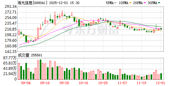 证券时报·数据宝统计显示,海光信息今日收盘价为216.03元,下跌0.58%,日换手率为1.10%,成交额为54.90亿元,全天主力资金净流出7462.51万元,近5日该股累计上涨3.73%,近5日资金合计净流出2.30亿元。