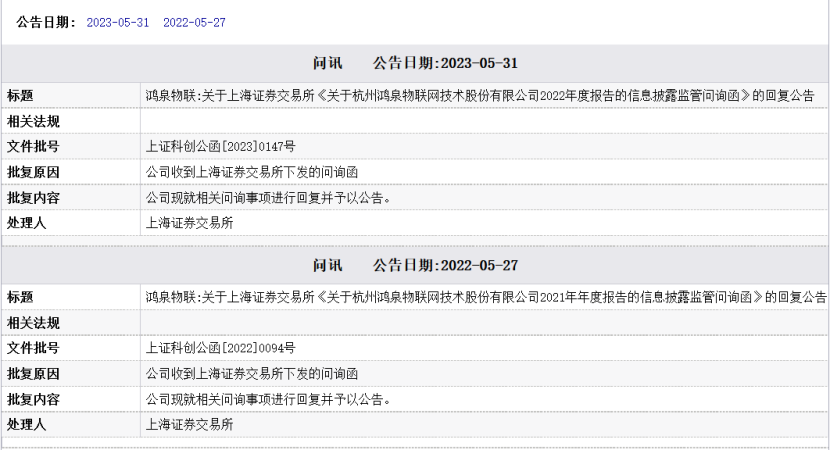 其中,2023年5月31日,鸿泉技术发布公告称,收到上海证券交易所就其2022年度报告下发的信息披露监管问询函,并就相关事项进行了回复;而在2022年5月27日,该公司已因2021年度报告的信息披露问题,收到过上海证券交易所的监管问询,当时同样就问询事项进行了回复并公告。