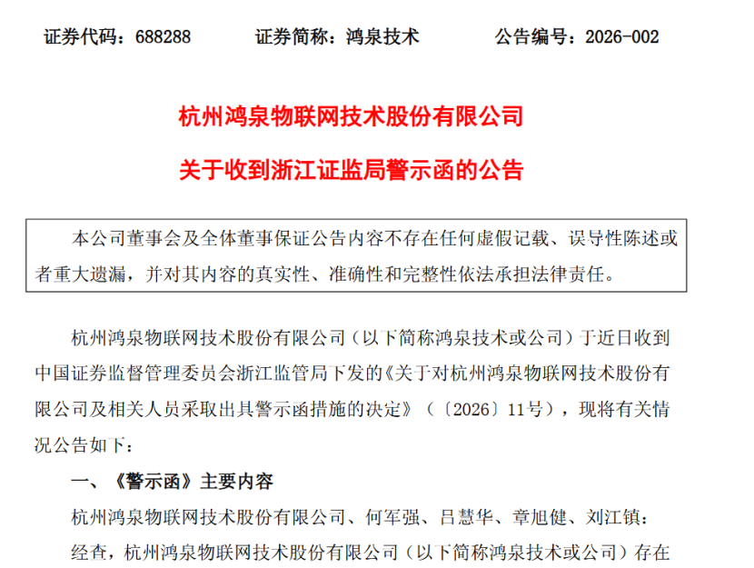 《科创板日报》1月16日讯(记者 吴旭光) 1月15日晚间,上交所科创板公司管理部发布关于对杭州鸿泉物联网技术股份有限公司及有关责任人予以监管警示的决定。