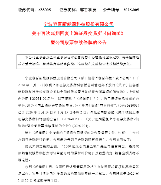1月15日晚间,容百科技发布再次延期回复上海证券交易所《问询函》相关公告。公告称,公司于2026年1月13日收到上交所问询函,涉及与宁德时代签署的日常经营合同事项。由于《问询函》涉及的其他事项需要进一步核实,公司股票于2026年1月16日继续停牌1日。