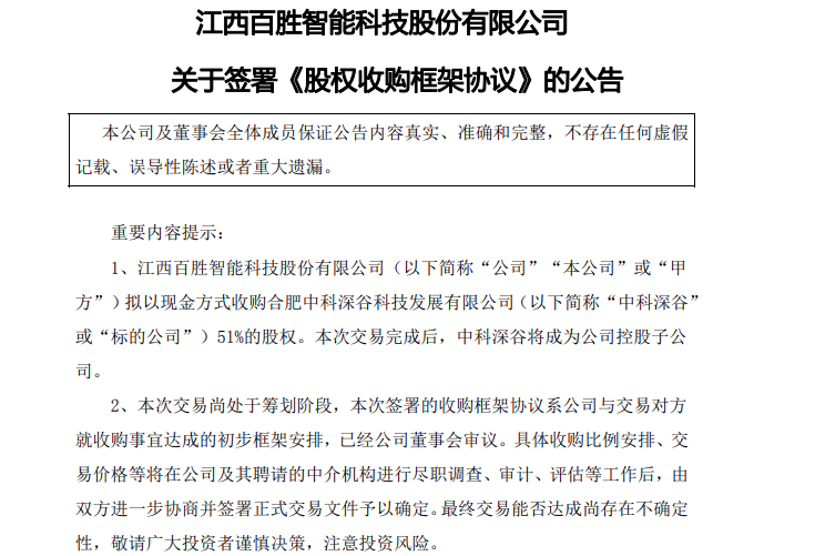 近日,江西百胜智能科技股份有限公司(以下简称“百胜智能”)发布公告称,拟以现金方式收购合肥中科深谷科技发展有限公司(以下简称“中科深谷”)51%的股权。本次交易完成后,中科深谷将成为百胜智能控股子公司。