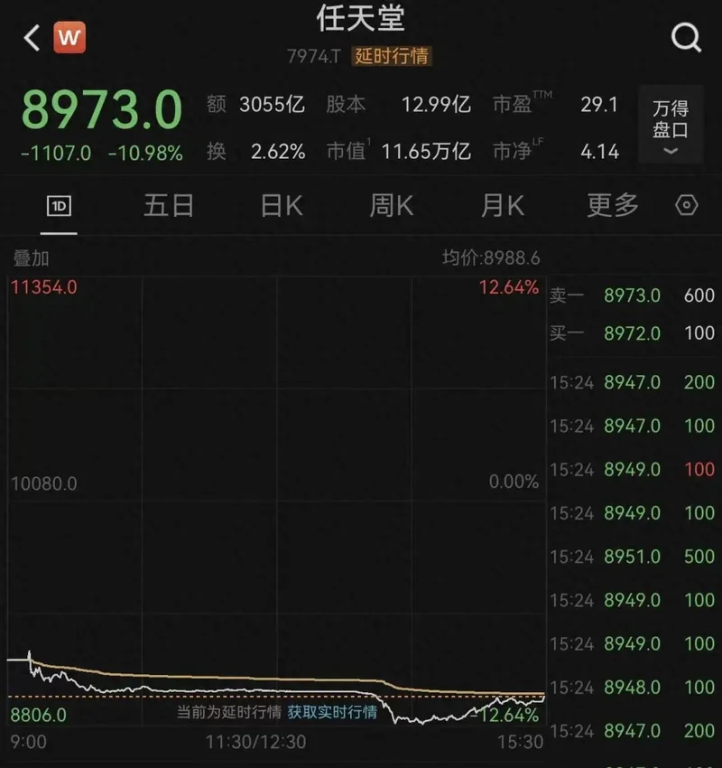 今日(2月4日),在日本股票市场上,知名电子游戏公司任天堂的股价放量暴跌,盘中跌幅一度超过12%,创18个月来最大单日跌幅,截至收盘,股价仍大跌近11%,单日市值蒸发1.44万亿日元,折合人民币约640亿元。