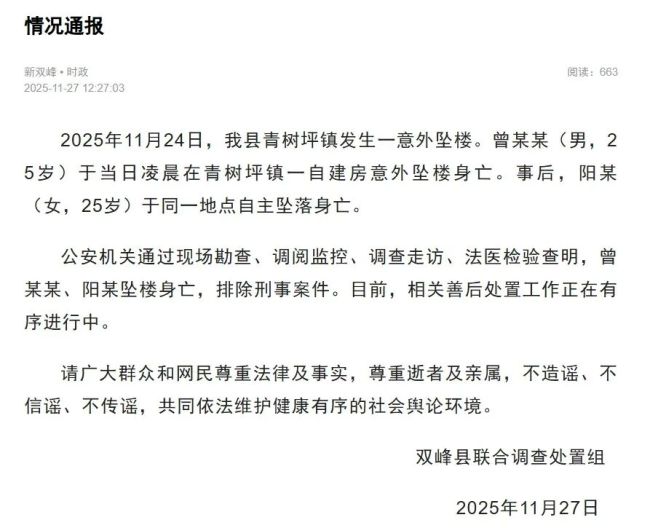 11月27日,湖南通报“恋人结婚前一天先后坠楼身亡”:曾某某(男,25岁)意外坠楼身亡,阳某(女,25岁)自主坠落身亡,排除刑事案件