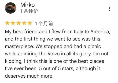 “我和我最好的朋友从意大利飞到美国,我们第一件事就是去参观这件杰作。我们一边停在这里野餐,一边欣赏这辆沃尔沃的美。我没在开玩笑,我觉得这是我去过的最棒的地方之一。5星好评,其实它值得更高的评价。”