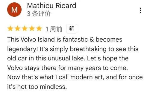 “这个沃尔沃岛真的很棒,它会成为传奇的!看到这辆老式汽车停在那么特别的湖中间,太超乎想象了。希望这辆沃尔沃能一直留在那里陪伴我们很多年。这才是真正的现代艺术,而且难得的是,一点都不肤浅。”