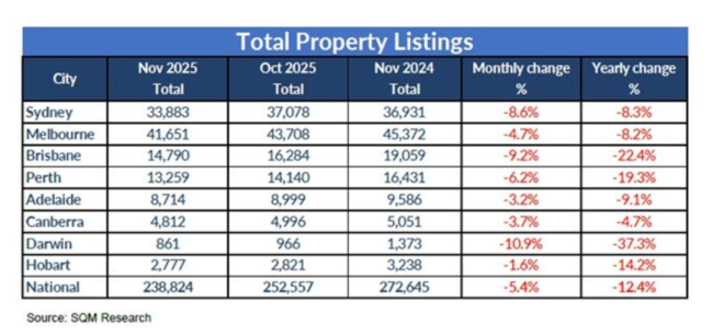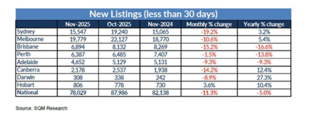SQMResearch的LouisChristopher表示,11月挂牌数量下降与春季后的季节性放缓一致。