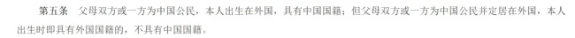 中国的国籍法第五条已经明确规定:“父母双方或一方为中国公民,本人出生在外国,具有中国国籍。”