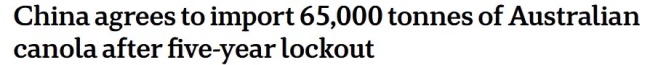 这批6.5万吨的试运货物表明,澳洲价值40亿澳元的油菜籽出口产业有望重新打开中国市场的大门,后者曾是澳洲最有价值的客户之一。