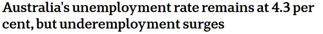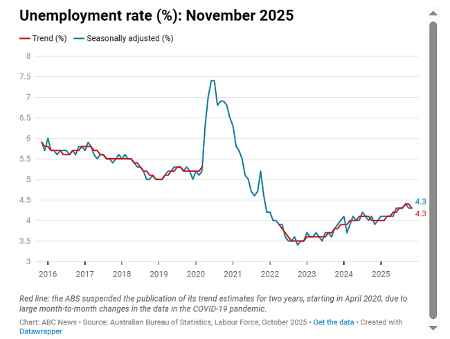 季节性调整后,澳洲11月的失业率维持在4.3%。但未充分就业率则从5.7%升至6.2%,创近一年多来新高。