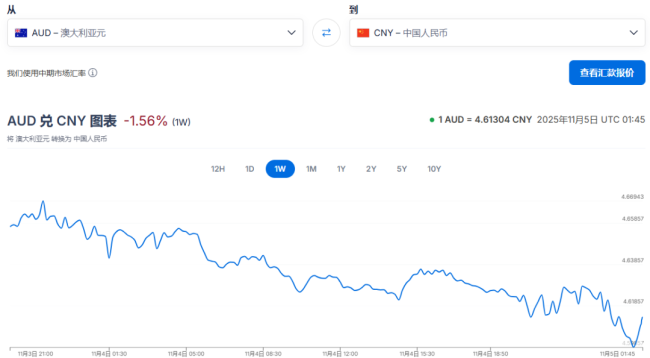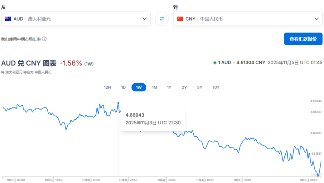 看一看今天的汇率走势吧,澳币兑人民币汇率一度跌破了1:4.6的关口,最低值来到了1:4.598!