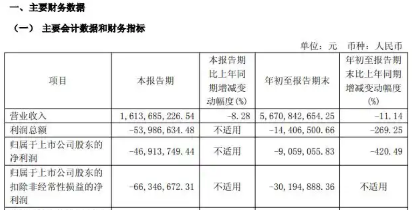令人意外的是,其前三季度出现了亏损。报告显示,前三季度累计营业收入约为56.71亿元,同比下降11.14%;同期归属于上市公司股东的净利润为亏损905.91万元,同比大幅下滑420.49%。