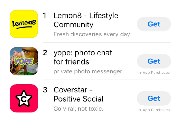 TikTok 的姊妹平台 Lemon8(同属字节跳动公司)在周三上午位居榜首,其次是 Yope 和 Coverstar。