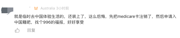 “就是临时去中国体验生活的,还装上了,这么后悔,先把medicare卡注销了,然后申请入中国籍吧,找个996的福报,好好享受”