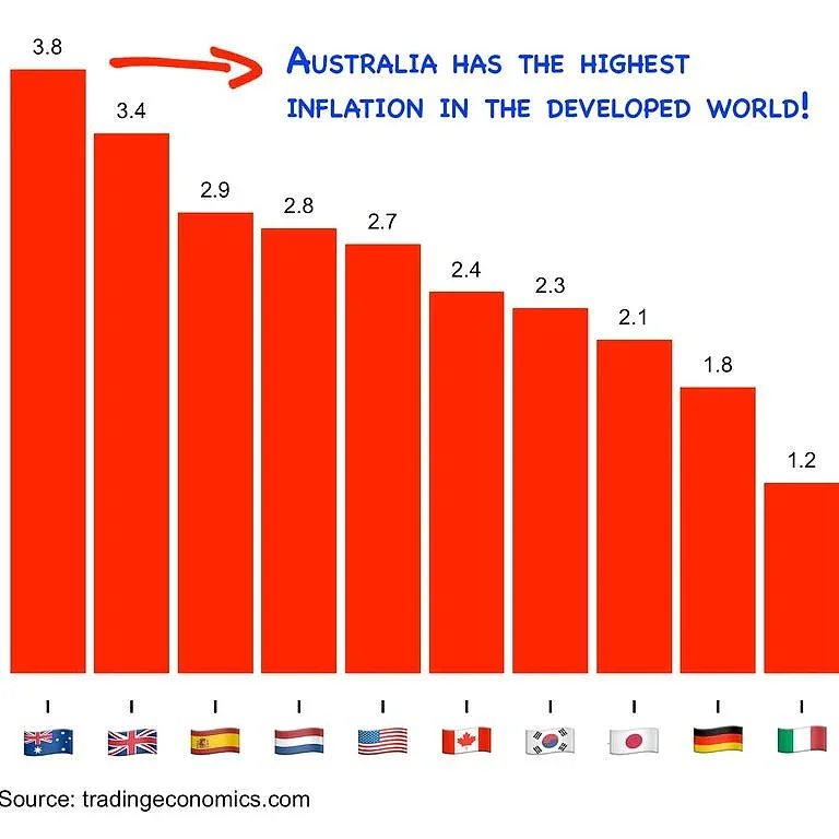 数据显示,澳洲通胀率已位于发达国家第一。联邦财长Jim Chalmers承认,最新数据显示上月年通胀率已升至3.8%,这一结果确实“高于政府预期”。