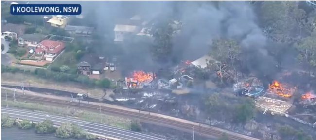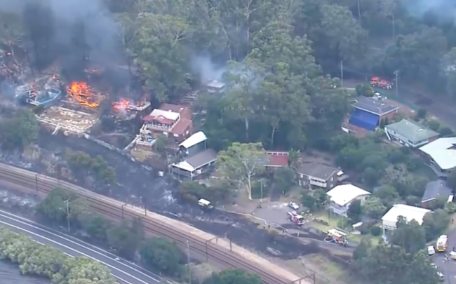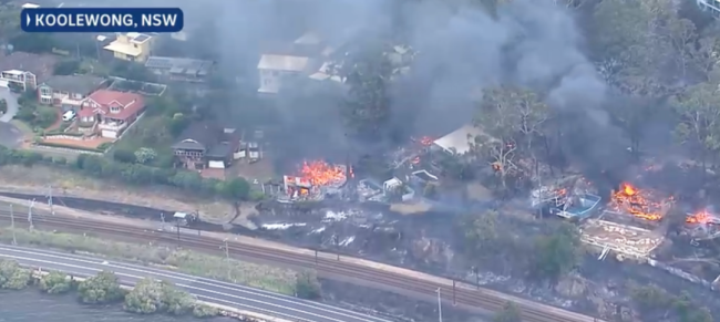 火点位于宁宾路(Nimbin Road),靠近铁路,现场可见房屋与树木在烈焰中冒起浓烟。