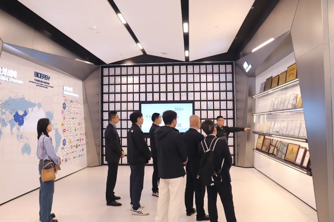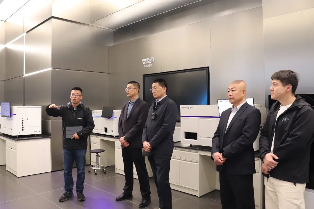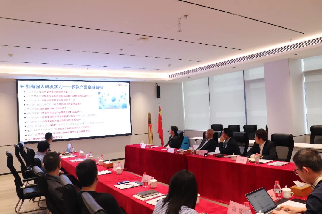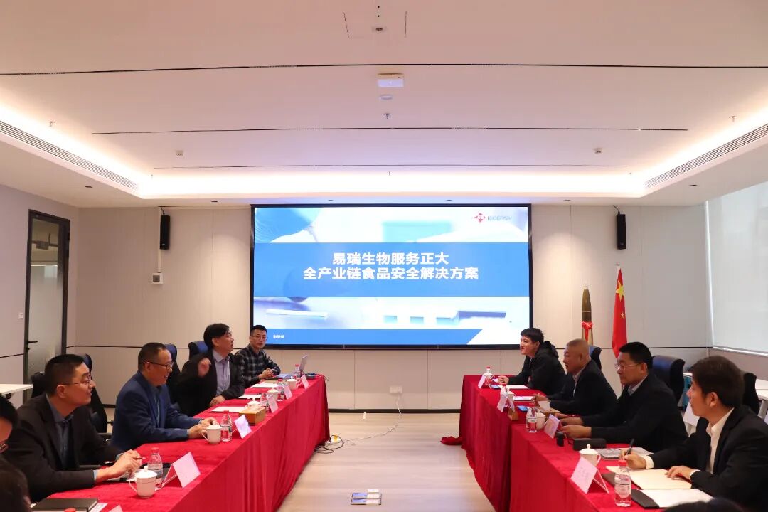 签约仪式前,董忠副董事长一行参观了易瑞生物展厅及智能化生产线,详细了解易瑞生物在食品安全快速检测、动物疫病诊断、数字化监测预警等领域的技术创新成果与质量管控体系。易瑞生物在生物试剂研发、检测设备制造及系统化解决方案上的综合实力,获得代表团高度评价。