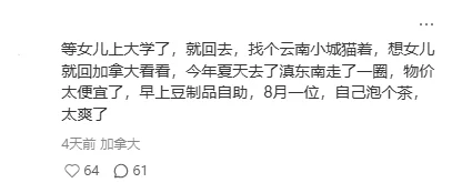 还有人已经规划好了理想生活:「等女儿上大学了,就回去,找个云南小城猫着,想女儿就回加拿大看看。今年夏天去了滇东南走了一圈,物价太便宜了,早上豆制品自助,8 元一位,自己泡个茶,太爽了。」