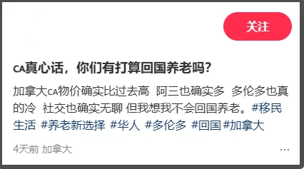 「加拿大物价确实比过去高,阿三也确实多,多伦多也真的冷,社交也确实无聊,但我想我不会回国养老。」