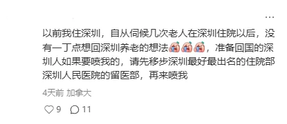 然而并非所有人都向往回国养老,一位网友的经历让很多人沉默:「以前我住深圳,自从伺候几次老人在深圳住院以后,没有一丁点想回深圳养老的想法,准备回国的深圳人如果要喷我的,请先移步深圳最好最出名的住院部深圳人民医院的留医部,再来喷我。」