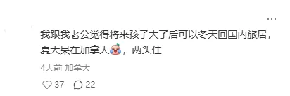 也有夫妻达成了两头舒服的共识:「我跟我老公觉得将来孩子大了后可以冬天回国内旅居夏天呆在加拿大,两头住。」