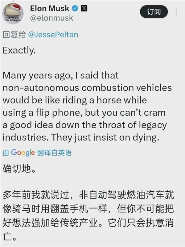 对于福特的这一调整,马斯克作出回应,直言这标志着传统汽车行业已经无可救药地走向衰落和死亡。