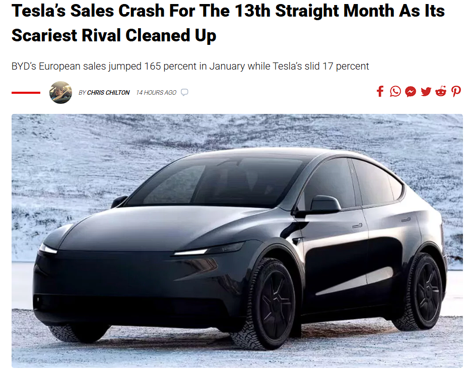 然而中国车企比亚迪却逆势而上,1月在上述地区销量达到18242辆,是特斯拉的2.26倍之多,同比增长165%,市占率达到1.9%。
