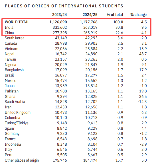 印度留学生数量稳步增长,首次超过中国成为最大国际学生来源国。