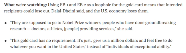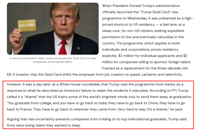 而讽刺的是,“金卡”计划恰恰瞄准这部分人群,为希望留美发展的高技能毕业生提供“钞能力”解决方案。