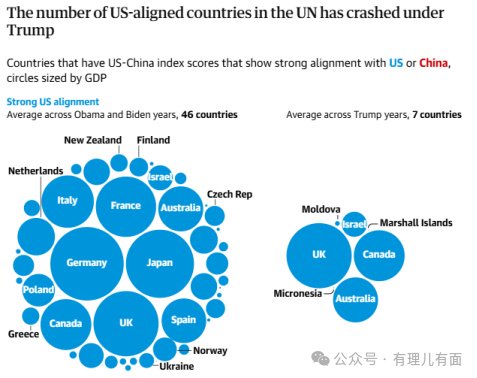 变化最大的,就是欧洲、北美、亚洲的那些老牌追随者。过去这些国家,基本是美国说投啥就投啥,现在呢?跟华盛顿投票一致的频率,降得离谱。
