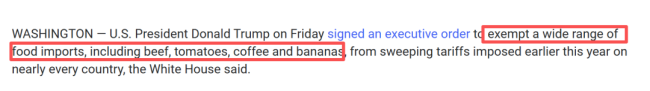 当地时间今天下午,特朗普紧急签署行政令:豁免包括牛肉、番茄、咖啡、香蕉在内的大范围食品关税,并立即追溯从本周四午夜开始的进口货!