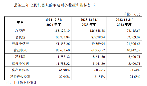2022-2024年,七腾机器人营收从4.09亿元增长至9.36亿元,两年间实现翻倍增长;净利润从0.54亿元提升至1.18亿元,盈利能力稳步增强。