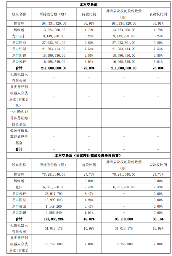 近日,胜通能源股份有限公司(以下简称“胜通能源”)发布公告称,公司控股股东、实际控制人魏吉胜先生、张伟先生、魏红越女士及龙口云轩、龙口同益、龙口弦诚及龙口新耀将其持有的84,643,776股股份(占胜通能源总股本的29.99%)以每股13.28元、合计11.24亿元的价格,转让给七腾机器人有限公司(以下简称“七腾机器人”)及其一致行动人重庆智行创机器人合伙企业(有限合伙)等。