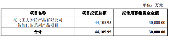王力安防2025年9月23日披露的2024年度以简易程序向特定对象发行A股股票预案(修订稿) 显示,根据本次发行的竞价结果,发行对象拟认购金额合计为30,000万元,募集资金在扣除相关发行费用后的募集资金净额将全部用于以下项目:湖北王力安防产品有限公司智能门窗系列产品项目。