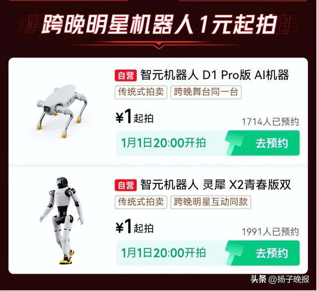 为了回应广大用户的热情诉求,京东迅速推出重磅福利,2026年1月1日晚8点开启明星同款机器人专场拍卖直播。此次拍卖的产品包括了跨晚舞台上与王心凌搭档演出的智元灵犀X2人形机器人,以及与黄晓明、王鹤棣、张颜齐、孟子义等明星互动的智元D1 Pro四足机器狗,所有产品均限时1元起拍。用户只需在京东APP内搜索“王心凌机器人”“王鹤棣机器人”,即可一键直达拍卖会场,以高性价比将明星同款黑科技带回家,让青春回忆与智能生活完美融合。