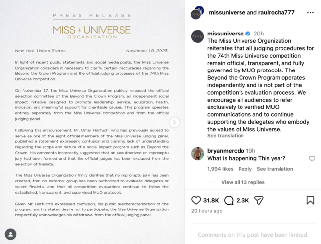 他们说超越皇冠委员会是一个“独立的社会影响倡议”,与官方评判无关,并重申“第74届环球小姐大赛的所有评判程序仍然是官方的、透明的,并且完全受环球小姐组织规程的约束。”