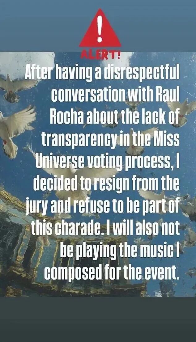 黎巴嫩作曲家、环球小姐比赛的官方评委奥马尔·哈尔富什在社交媒体上宣布辞职…而且是在第74届环球小姐大赛开幕仅剩三天之际。