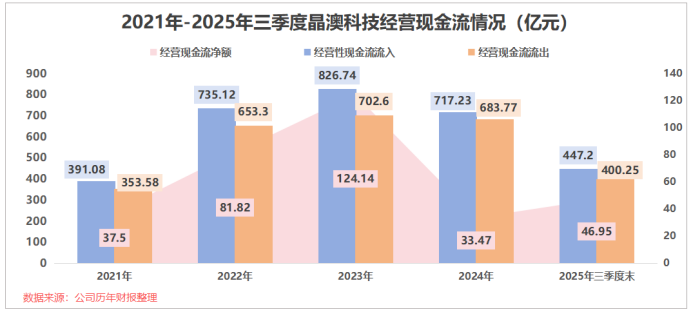 这使得2025年前三季度,晶澳科技采购材料的相关支出减少、支付职工的现金支出减少等,经营现金流净额达到46.95亿元,同比增长1916.16%。