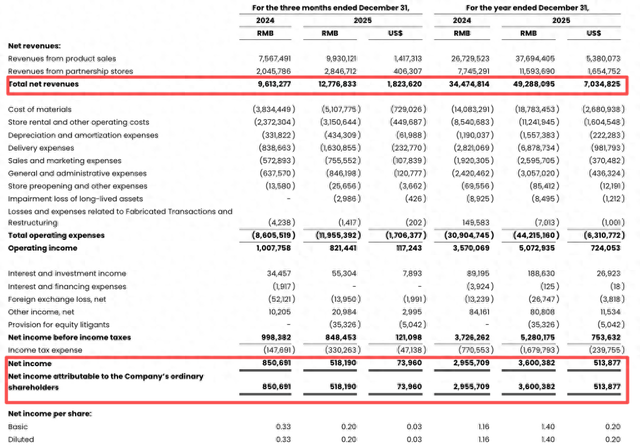 2月26日美股盘前,瑞幸咖啡(OTC:LKNCY)公布了2025年第四季度及全年财报。财报显示,去年第四季度总净收入为127.78亿元,同比增长32.9%;在美国会计准则(GAAP)下营业利润为8.21亿元,据计算同比下滑18.5%;GAAP营业利润率降至6.41%,上年同期为10.5%;净利润达5.18亿元,同比下滑近四成。净利润率为4.1%,上年同期为8.8%。