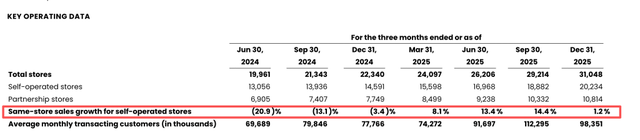 具体来看财报,去年四季度,瑞幸咖啡自营门店同店销售额增长1.2%,较2024年同期的-3.4%大幅改善。门店层面的营业利润方面,自营门店营业利润率为15%,而上年同期为19.8%。GAAP营业利润率为6.4%,而上年同期为10.5%。