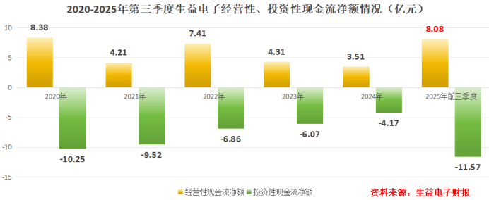 2025年前三季度,生益电子经营性现金流净流入8.08亿元,几乎达到其2020年的最高水平。现金流的及时补血,一方面为其产能建设提供了持续的资金支撑;另一方面也缓解了其投资性现金流净流出所带来的压力。
