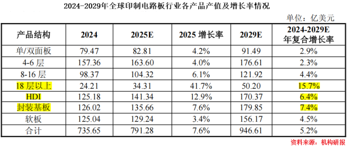 机构预测,2024-2029年,18层以上、HDI和封装基板这类高性能PCB的年复合增长率都处于产品中的最高梯队。